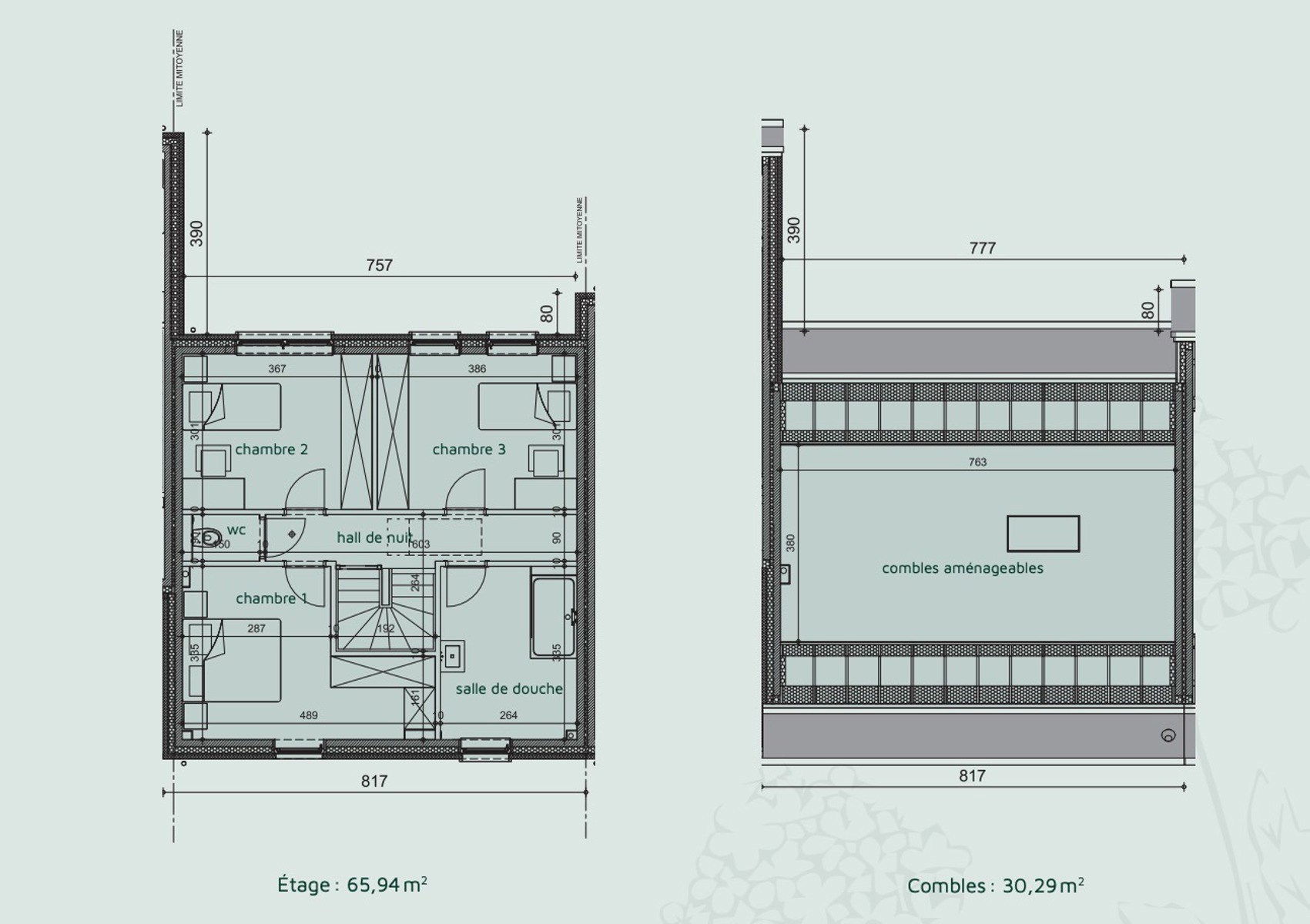 • 3 chambres + combles aménageables (30,29 m²)