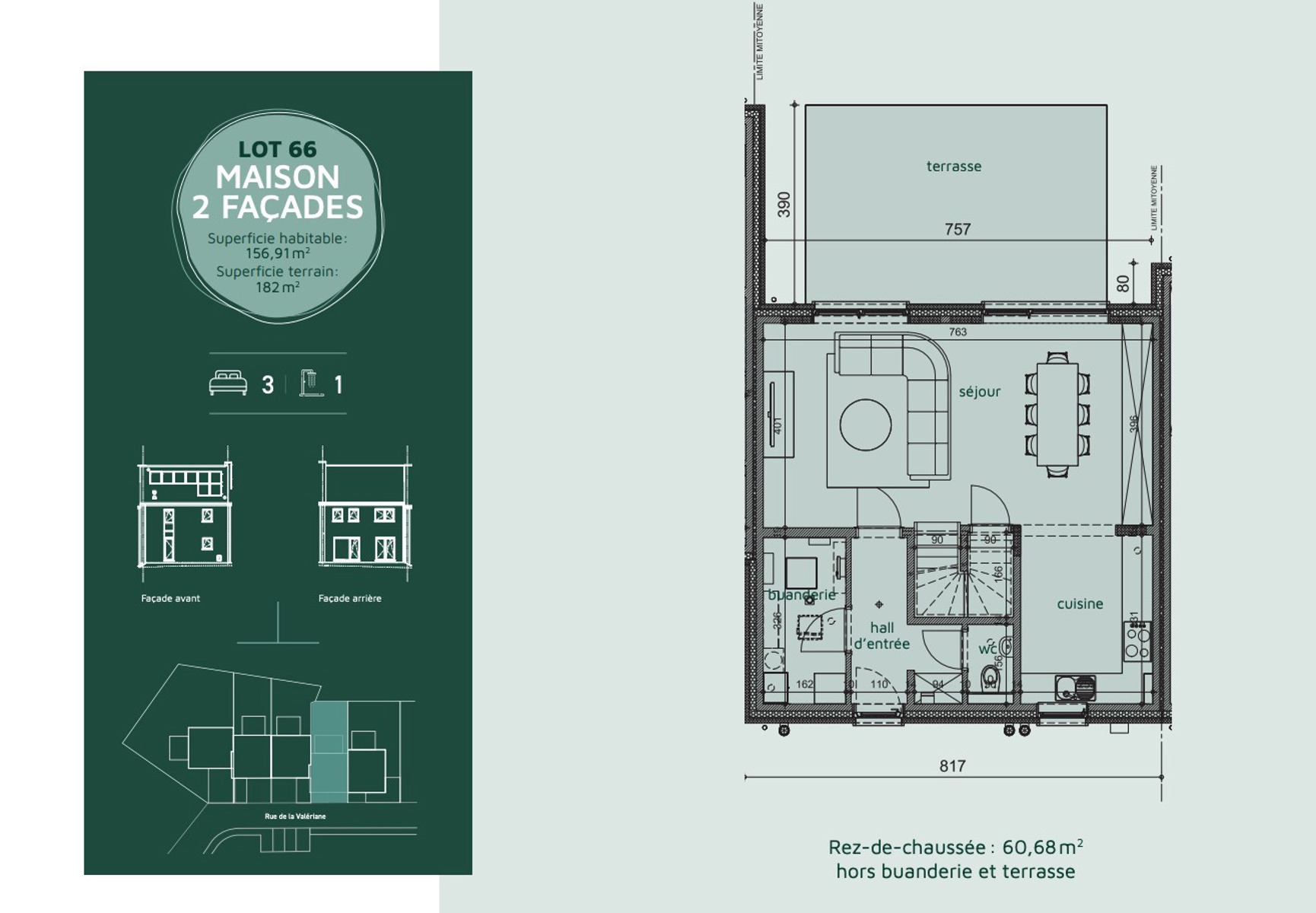 LOT 66 – MAISON 2 FAÇADES NEUVE (TVA 21% sur construction) Surface habitable : 156,91 m² – Terrain : 182 m²